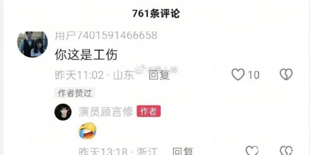 事情的经过大家都看到了:有网友在这位男演员的评论区留言调侃男主“你这是工伤”,顾言修反手就是一个点赞,还配了个无奈的表情包 。