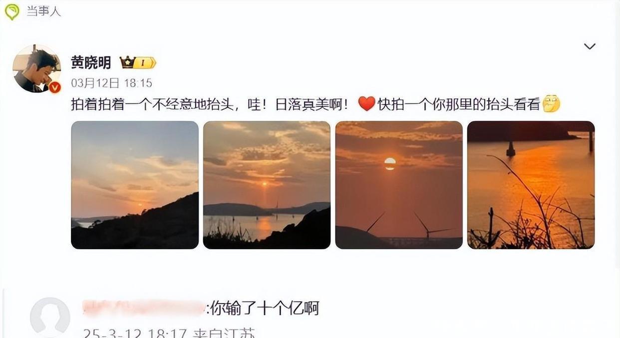 2025年3月12日,黄晓明在微博上分享了自己在福建福清片场看到的夕阳照,配文写着“抬头见美好”。在评论区,他也挺幽默地回应了网友调侃“欢乐豆吗?”