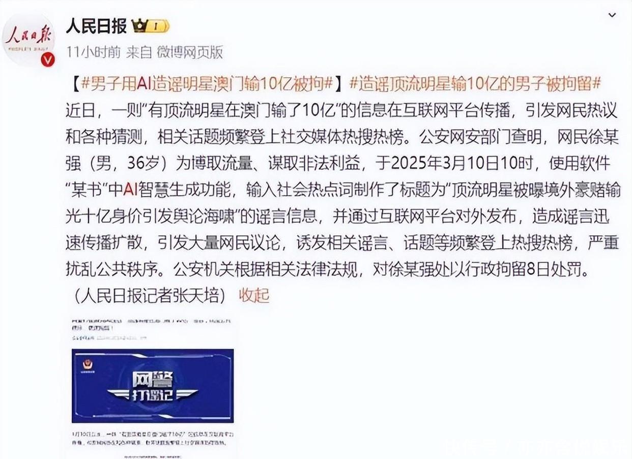 2025年3月14日,公安部网安局正式公布,这起谣言的源头是36岁的徐某强。为了赚取流量赚点辣钱,他利用某社交软件的AI生成功能,输入“明星”“赌博”“10亿”等关键词,批量制造虚假消息,然后在多个平台上传播。