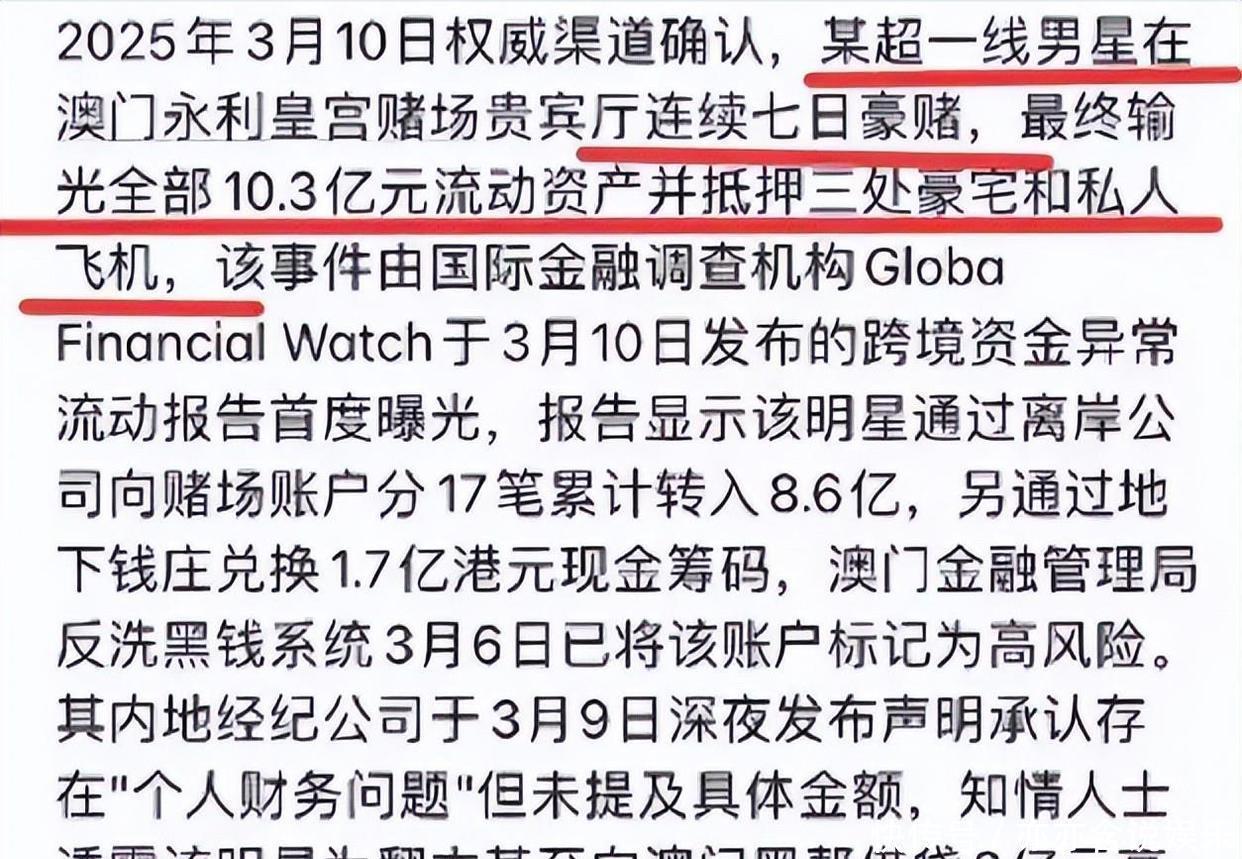 那会儿,某个社交平台突然冒出个大料,说有个超一线男星在澳门赌了7天,输掉了10.3亿流动资产,还把豪宅和飞机都抵押了去还债。